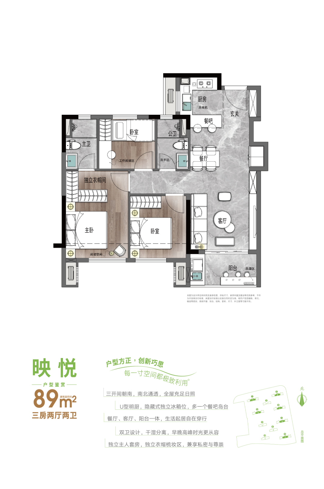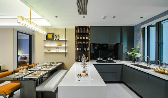 1号楼推出的建面约89平方米中间户,次卧进深增加了20厘米,确保了衣柜和储物空间的有序收纳,并预留了独立内嵌冰箱位,使餐厨空间更加从容。同样面积的端户户型,客厅面宽达到了3.4米,比市面同类户型多出30厘米,空间更加敞阔。