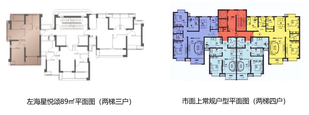 左海星悦颂不仅在地段、配套和社区品质上表现出色,更在产品设计上精益求精,将“稀缺”二字贯穿始终。以89㎡户型为例,左海星悦颂的89㎡产品与市面上普遍的89㎡产品有着显著的区别,主要体现在梯户比和户型设计两方面。