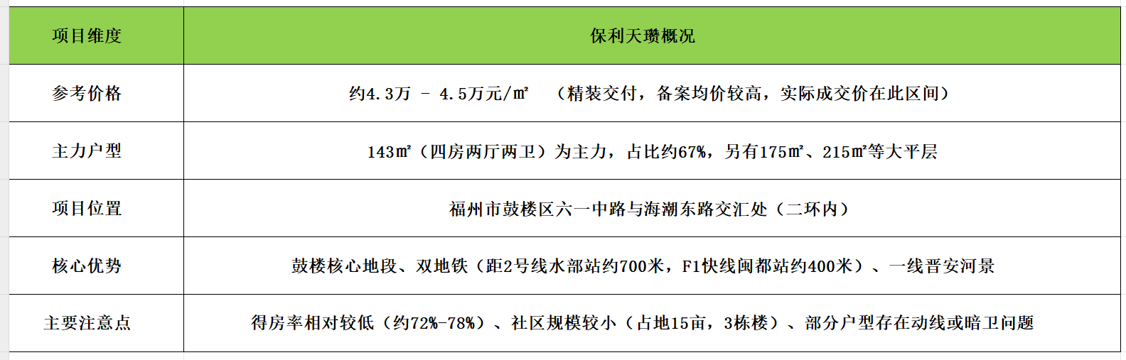 福州保利天瓒是保利“天字系”在鼓楼区打造的高端住宅项目,自亮相以来关注度很高。为了让你能快速把握全局,我先用一个表格梳理它的核心信息。
