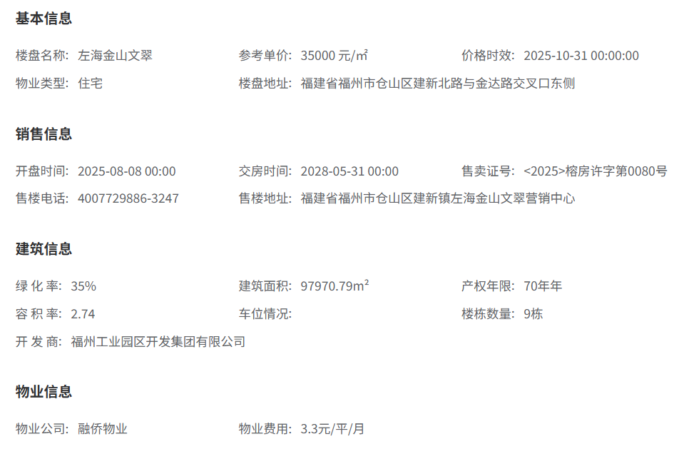 左海·金山文翠位于福州市仓山区建新北路与金达路交叉口东侧,是金山片区备受关注的新盘。作为左海集团“翠系”高端产品线的作品,该项目主打128-149㎡的改善户型,精装均价约3.5万/㎡,定位为**海派学院风格**的轻奢住宅。 01 项目概况:国企开发的学区新房
