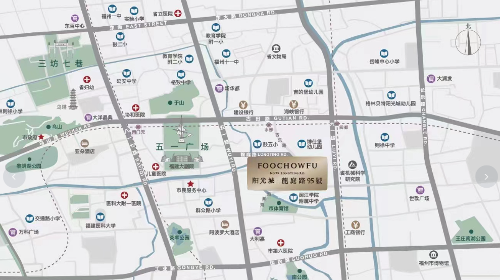 阳光城龍庭路95號最大的卖点在于其不可复制的地段优势。项目坐落于福州市鼓楼区传统核心板块,是福州行政、文化、教育和医疗资源的集中地。