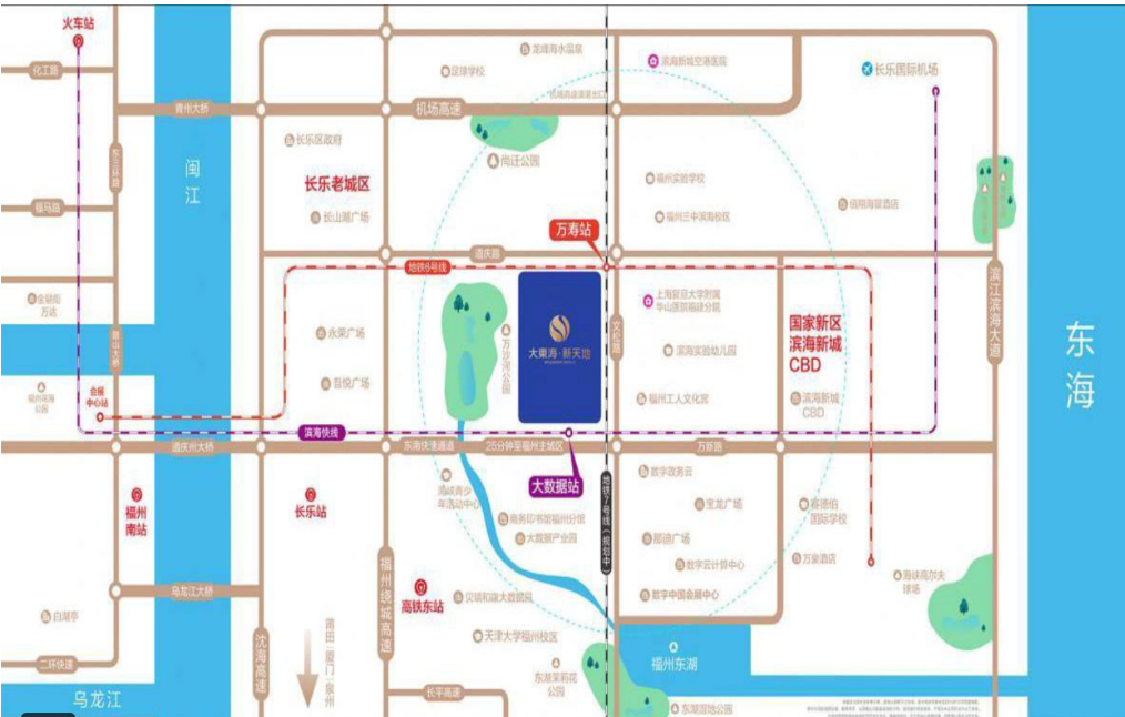 大东海新天地坐落于福州长乐滨海新城CBD核心区,隶属于文武砂街道,是福州“东进南下”战略的核心区域。项目总建筑面积约510000㎡,规划包括阔景华宅、商务中心、商业MALL、城央墅等精品业态,打造近百万方TOD国际住区。