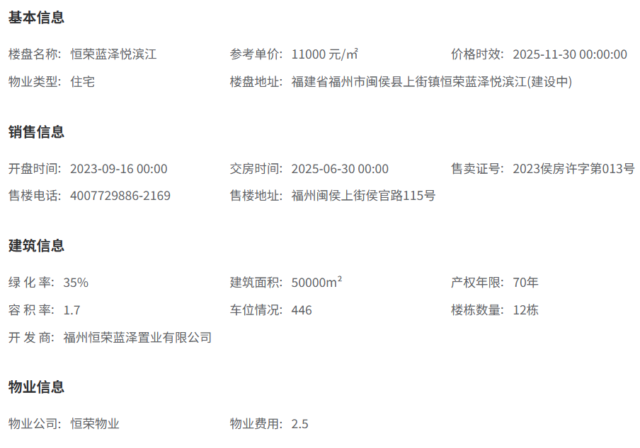 项目的开发商是福州恒荣蓝泽置业有限公司,物业公司为福州恒荣城物业管理有限公司,物业费为住宅2.5元/㎡·月。