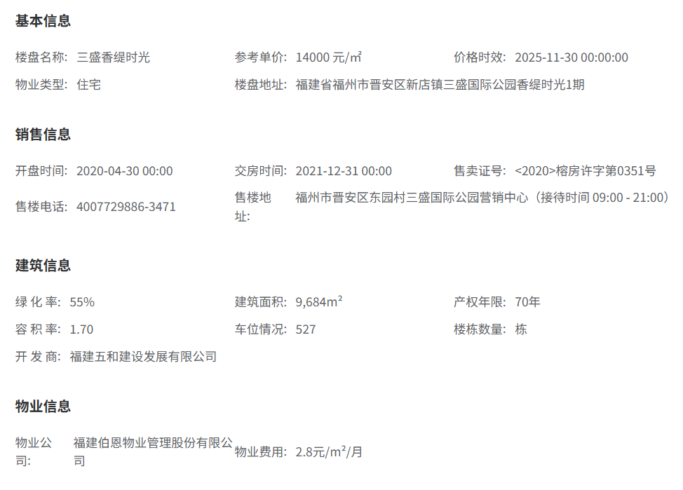目前,三盛香缇时光的住宅均价约为22000-27000元/平方米,相比福州同类区域具有较高性价比。小区参考价为20604元/㎡,近期价格保持稳定,环比上月上涨0.59%,显示出良好的保值能力。 开发商与物业:品质生活的双重保障