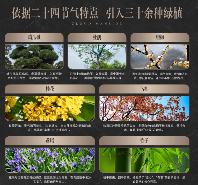 社区汲取老福州文化底蕴,依据二十四节气不同特点,重金引入三十余种花木绿植,营造“一轴四院八景”的奢雅之境。