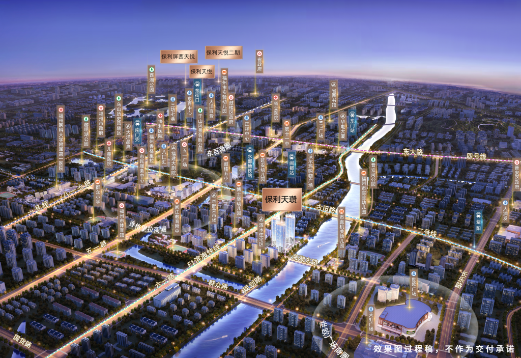 保利天瓒位于鼓楼区六一中路与海潮东路交汇处,地处福州传统城市中轴线上。这一位置兼具行政、商业、人文、生态等多重优势,是福州目前罕见的“双中心”地段(行政中心+商业中心)。