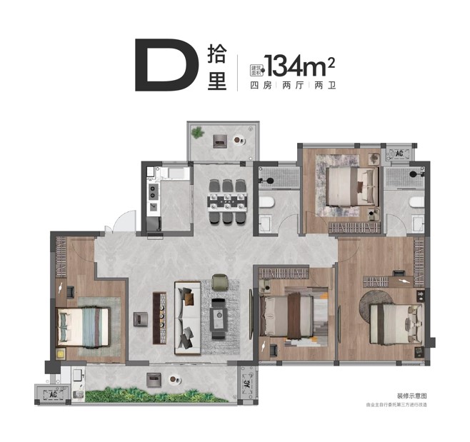 117-134平方米的改善四房则面向多代同居家庭,大面宽、短进深,134平方米户型采用南北双阳台设计,LDKB一体化空间达53平方米,南向面宽达14.4米,提供了阔绰的居住尺度。