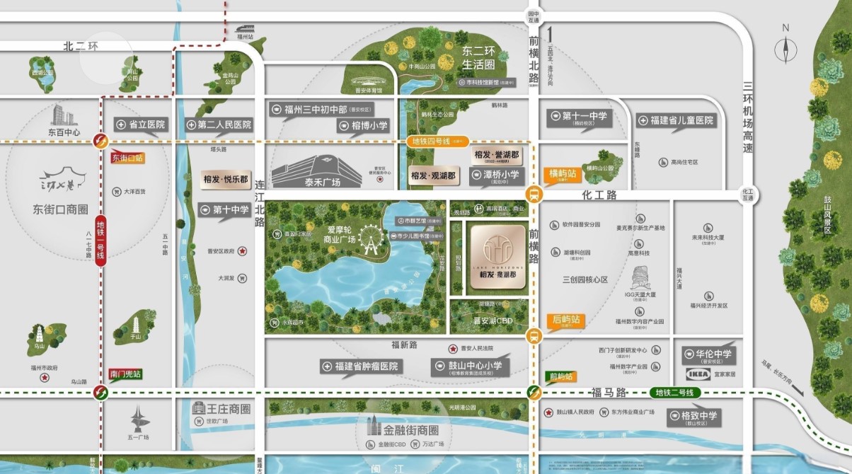 榕发誉湖位于晋安区东二环核心区域,最大亮点是地段的稀缺性与成熟配套。项目步行约50米即可到达地铁4号线横屿站,这是一条被称为“换乘之王”的线路,可轻松接驳1、2、5、6号线,15分钟直达东街口、金融街万达等商圈。