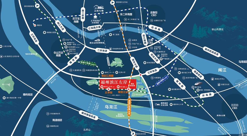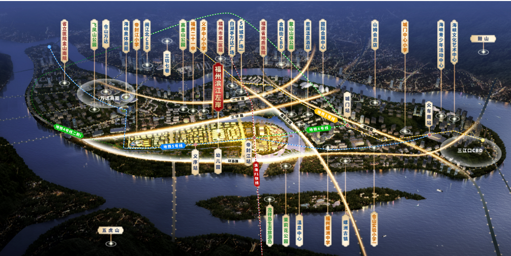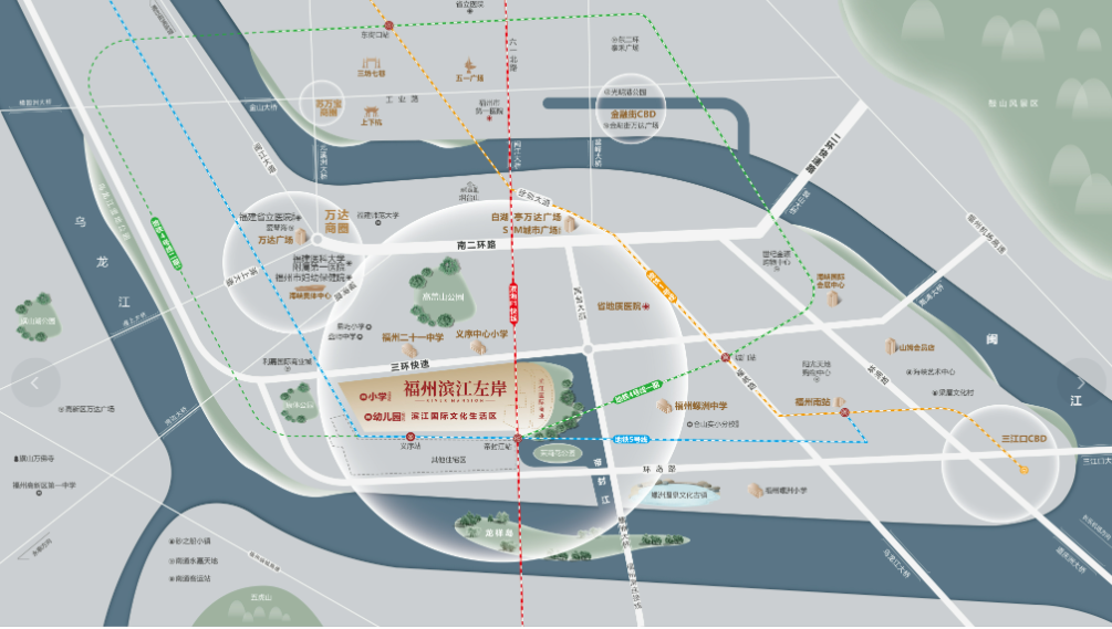 福州滨江左岸位于仓山区帝封江片区,三环路南侧,规划帝封江路北侧,原为恒大滨江左岸。项目占地面积约563.43亩,总建筑面积达59.13万平方米,打造集高层、公寓、商铺、写字楼于一体的560亩都会大城。