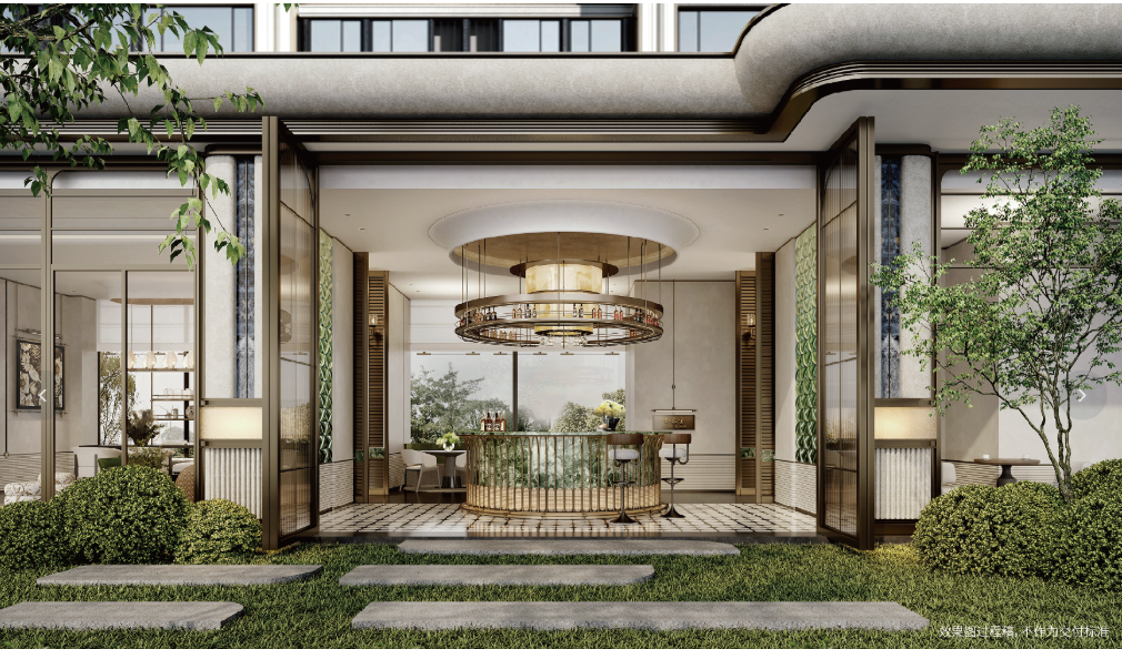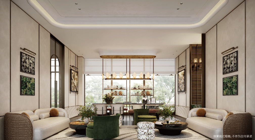 项目采用约3.05米奢阔层高,颠覆传统改善户型尺度,带来更通透的空间感与采光效果。主卧创新性地设计了约270°观景舱搭配巨幕落地窗,将城市盛景与社区绿意最大化引入室内。