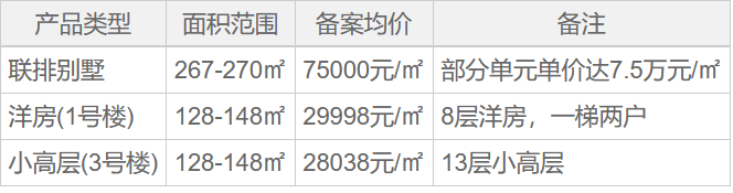 其中最受关注的是其“独院”产品——联排别墅,建筑面积267-270㎡,备案均价高达75000元/㎡。