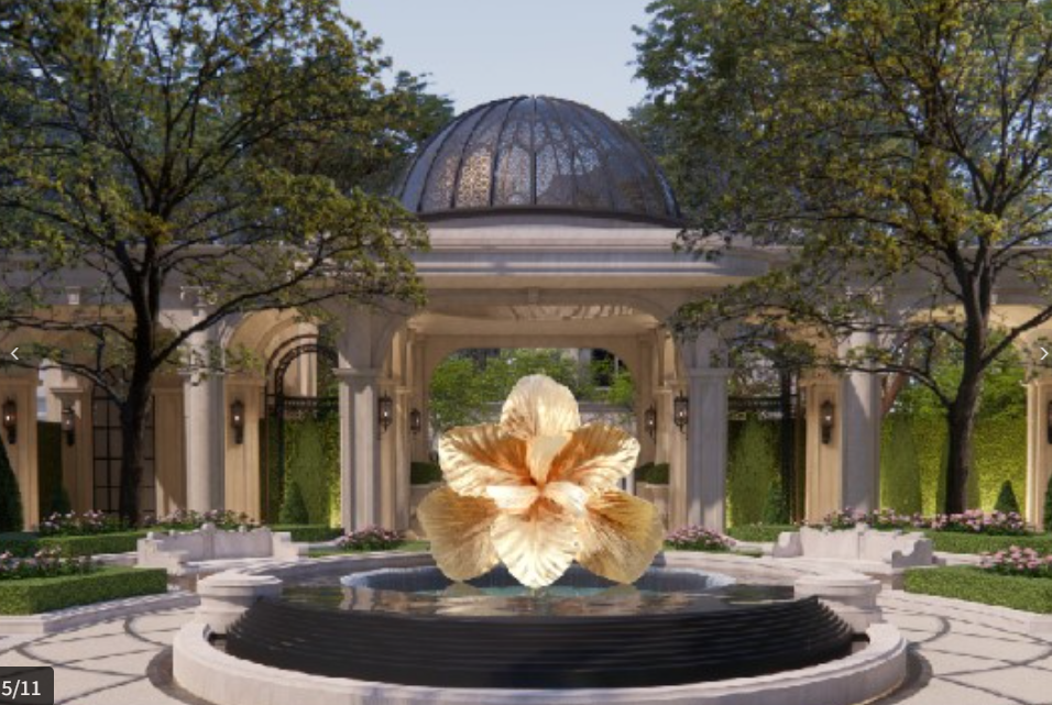 项目在建筑品质上投入较高,采用干挂石材外立面等高端建筑工艺。社区大门打造了近50米法式门庭,中央是定制水景,两侧矗立着5.5米高的整石立柱。
