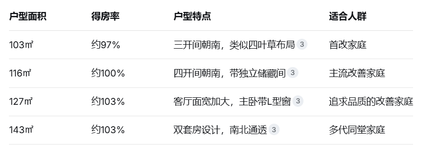 生态资源方面,项目周边规划有双体育公园和双鲜氧公园,其中智慧体育公园已投入使用,厦坊溪体育公园预计2026年建成。 03 核心卖点:户型与得房率