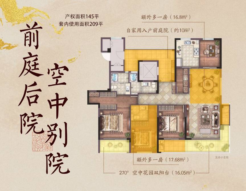 项目户型设计方正,得房率超高,部分户型甚至超过100%。主力户型110-155平方米均做到南北通透,采光充足。以145平方米户型为例,实现了四开间朝南,动静分区明确,并配有近10米的转角观景阳台,空间舒适度极高。小区建筑密度低,楼间距最宽处近60米,保障了业主的隐私和视野开阔性。