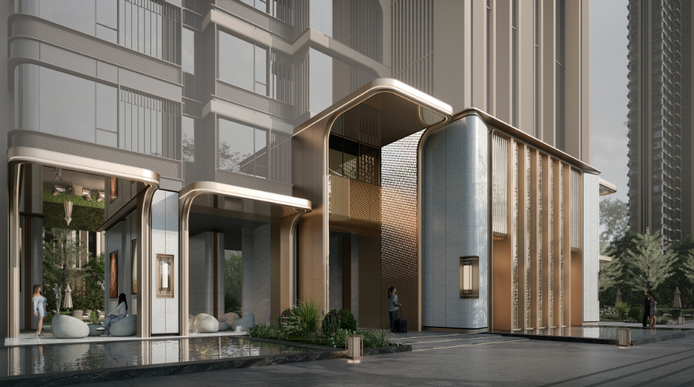 建总流花溪的住宅楼静静矗立在流花溪畔,它的外立面采用香槟色铝板与米白石材叠砌的几何造型。夜晚时分,社区的夜景照明会准时亮起。