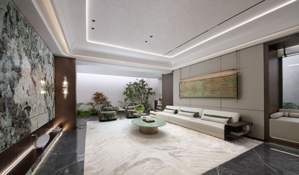 站在高定会所的落地窗前,向外望去是城市的天际线,向内则是一片5.2万平方米的绿意园林。