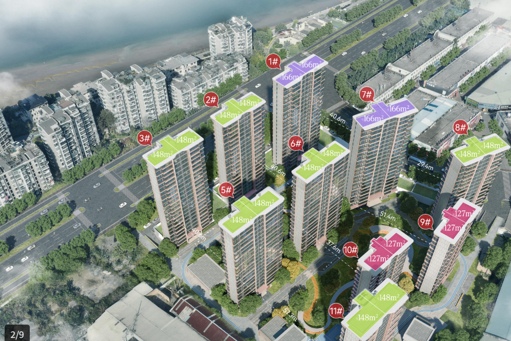 130平方米户型可做到四开间朝南,南北双阳台设计;166平方米户型实现双套房+瞰江阳台,采用大横厅和双向阳台设计。