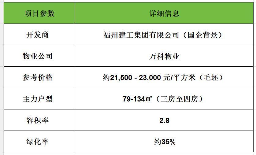 国企开发与品质保障:项目由福州建工集团开发,该集团为福州市属国企全资子公司,国企背景意味着资金实力相对雄厚,交付风险较低,在当前房地产市场环境下,这一点能为购房者带来更强的安全感。此外,项目引入了万科物业进行服务管理,物业费约为2.98元/平方米·月,其服务口碑优于许多本土中小物业公司,有助于保障未来社区的长期品质。