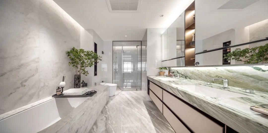 高品质配置与细节打磨体现了开发商的诚意。项目外立面采用曲面玻璃结合铝板,社区入口设计为长达60米的宝格丽酒店风格隐奢门庭,入户大堂挑高约7.8米。精装标准上,是福州少有的“新风、空调、地暖”均采用大金品牌的项目,并配备了科勒镜柜(带美妆冰箱)、德国唯宝等国际顶级卫浴品牌。