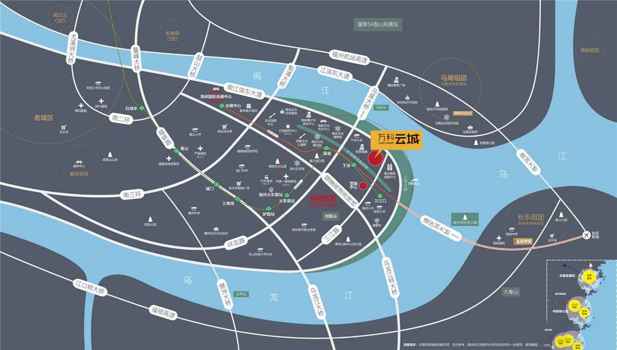万科云城地处三江口CBD核心区域,坐拥闽江、乌龙江、马江三江交汇的稀缺景观资源。该区域是福州市政府重点打造的“福州版陆家嘴”,周边公建配套密集,包括已建成的海峡会展中心、喜来登酒店、海峡文化艺术中心,以及规划中的海峡青少年活动中心、福文化公园等。