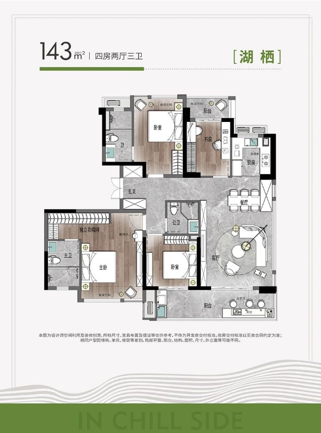 109-143㎡三房四房:空间阔绰,主打改善需求,特别是143㎡户型采用主卧套房设计,适合多代同堂的家庭,并能享受更佳的湖景视野。