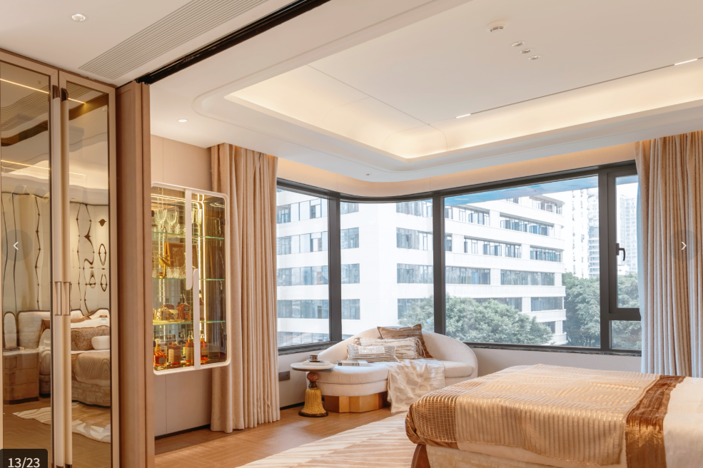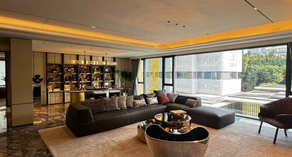 项目创新的270度曲面屏无立柱转角设计,打破了传统住宅的空间边界,将城市景观最大限度地引入室内。