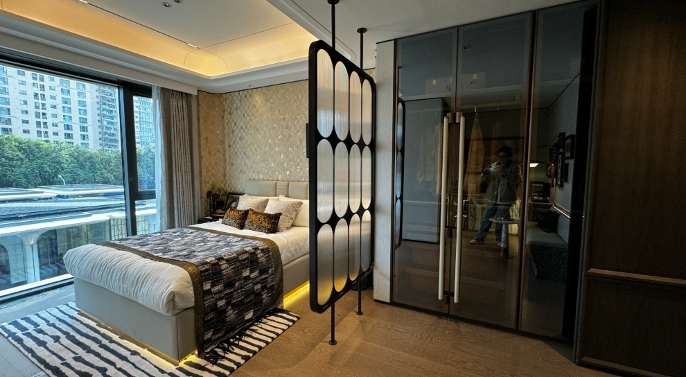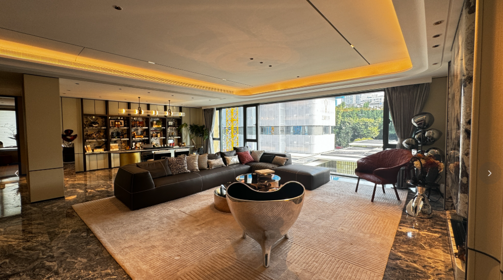 超过10000平方米的超大实景展示区里,下沉庭院连接着地下会所,几株珍稀的金桂树旁,购房者正在体验270度无立柱转角玻璃窗带来的震撼视野。