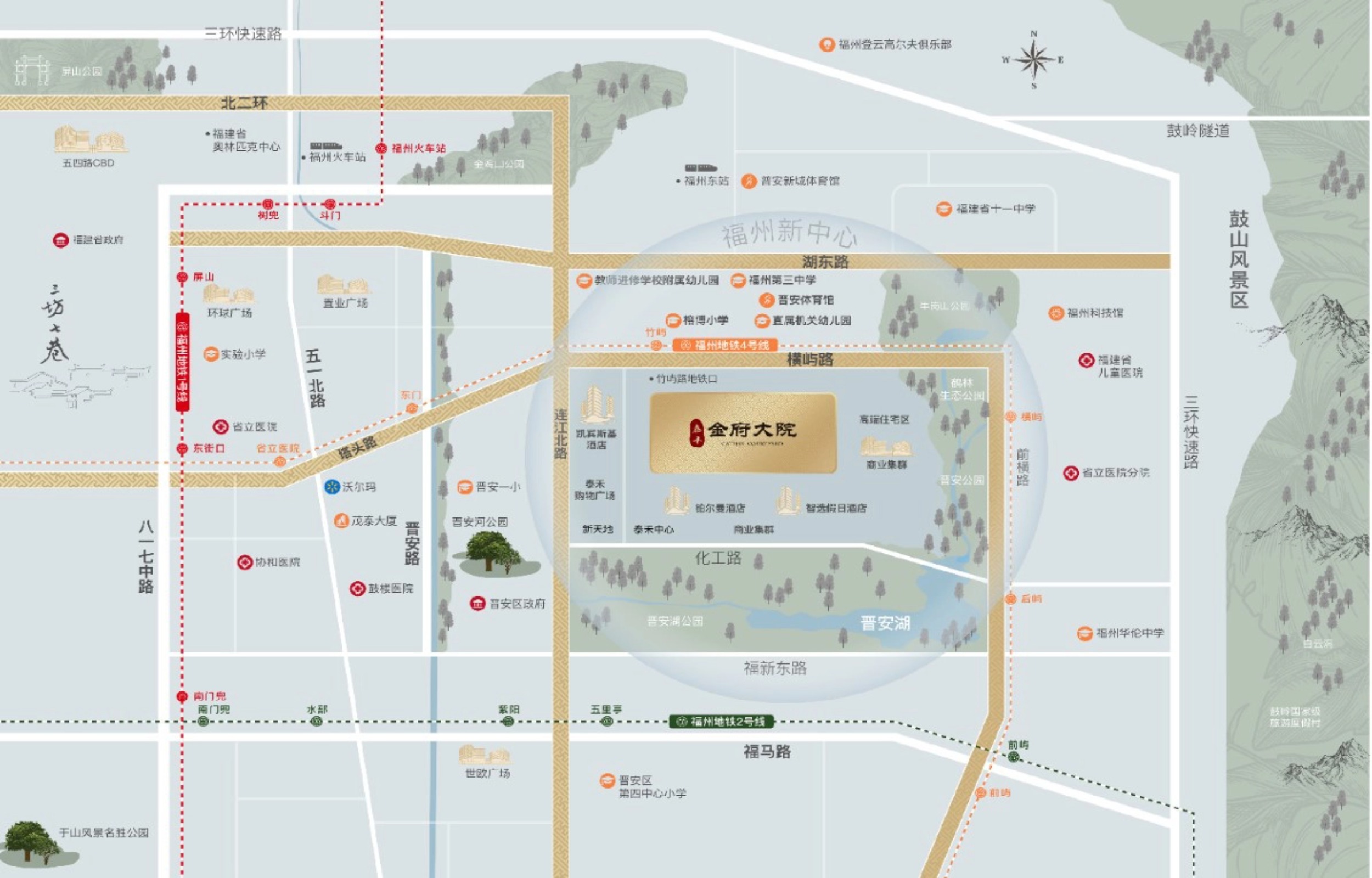 泰禾金府大院的地理位置堪称福州城市资源的集中展示。项目距地铁4号线泰禾广场站仅251米,周边有近20条公交线路,连江路、塔头路、化工路等城市主干道四通八达,可快速抵达火车站、机场等重要枢纽。