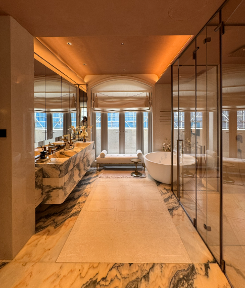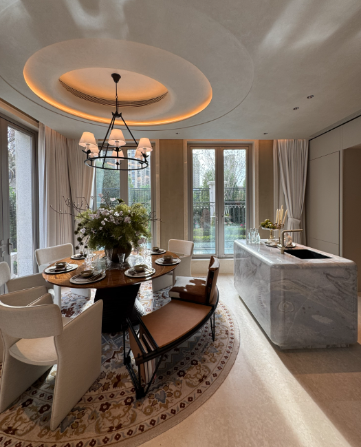 项目建筑采用纯正法式风格,孟莎式屋顶、古典拱心石、对称式构图,配合干挂石材的厚重质感,都在向法式庄园的仪式感致敬。