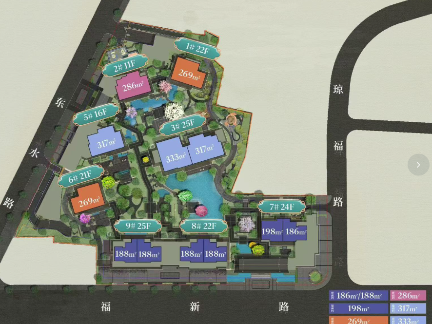 269-333㎡的户型则拥有更奢阔的空间设计。例如,333㎡西端头排户型可享270°三坊七巷+西湖景观,LDKG一体化公区面积超过一百平。