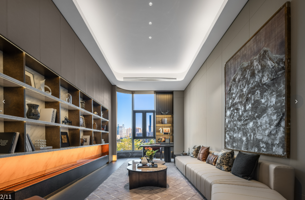 空间设计是项目最亮眼的部分。526平方米户型采用创新的12米双面采光厅设计,最大亮点是约30米巨幕江景阳台,实现270°环幕瞰江视野。