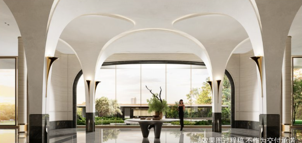 超百米玉廊,对标世界酒店标准的入户门仪;海派摩登的奢雅会所,以非遗工艺艺术品点缀时光;下沉式庭院,以现代手法还原四季光影的都市秘境。