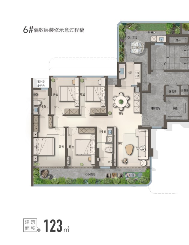 该项目主打“超四代住宅”概念,在第四代住宅基础上进行了三大创新升级:一是墅级尺度,将传统的LDKBG(餐客厨花园阳台)升级为LDKGY(餐客厨花园庭院),实现了从“阳台”到“庭院”的质变;二是高得房率,通过空中南北双花园设计,户内户外面积赠送率最高可达66%;三是灵活的生活系统,空中花园可与不同空间组合,形成多种生活场景。