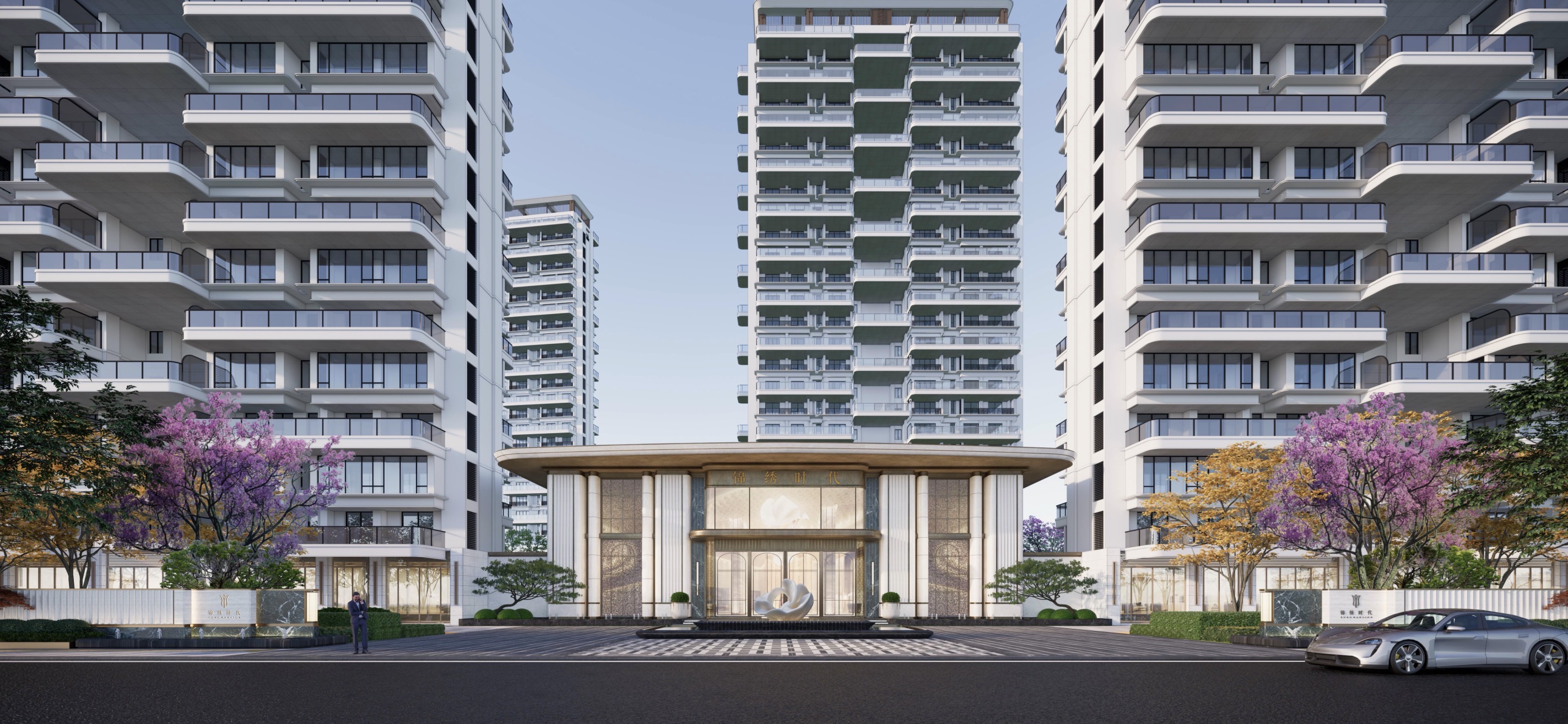 项目整体设计采用海派摩登风格,打造了约10米高的气派门庭,以及“一环·二轴·六景”的立体垂直景观体系。社区还规划有星空水苑、观景平台等设施,营造水陆空三层次园林体验。