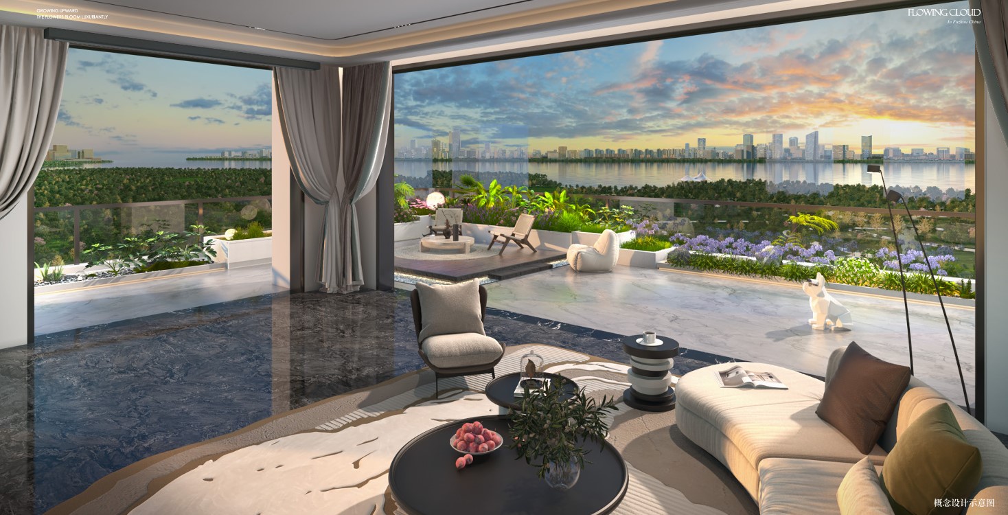 新榕·云行是福州新榕“水天系”的立标首作,以“立体滨水空中院落”为核心理念,将别墅的庭院生活垂直植入高层平层,实现了从“居住容器”到“生活操作系统”的升级。