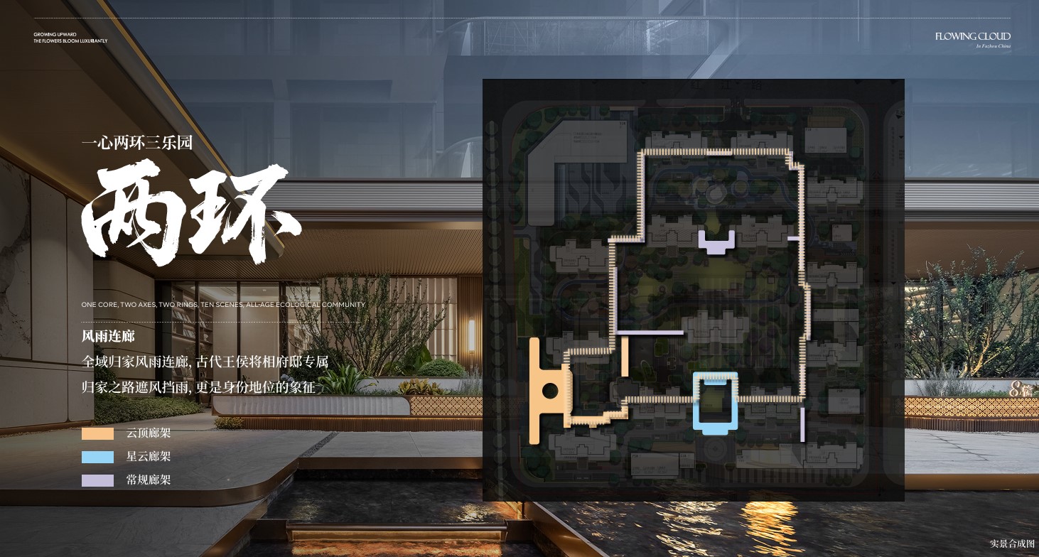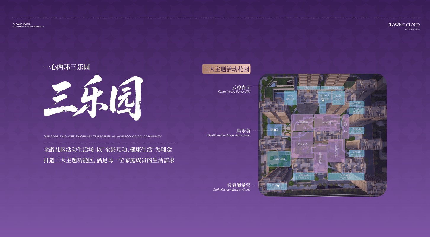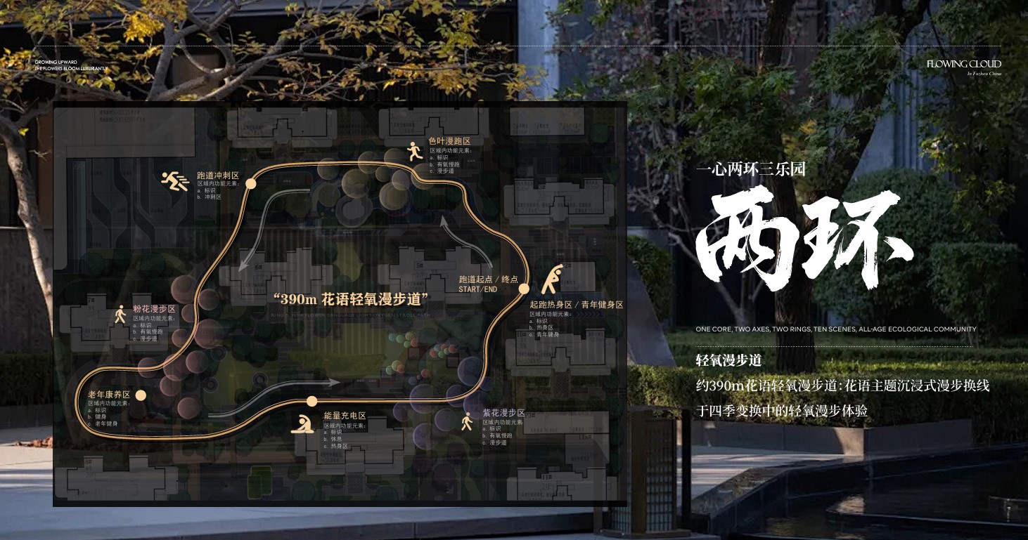 超过8000㎡的中心云享聚场采用四面围合、八方向心的布局,实现聚气纳财之势与户户观景均好。约390米的“花语轻氧漫步道”与艺术云廊,串联起中央花园、休闲会所与邻里空间。