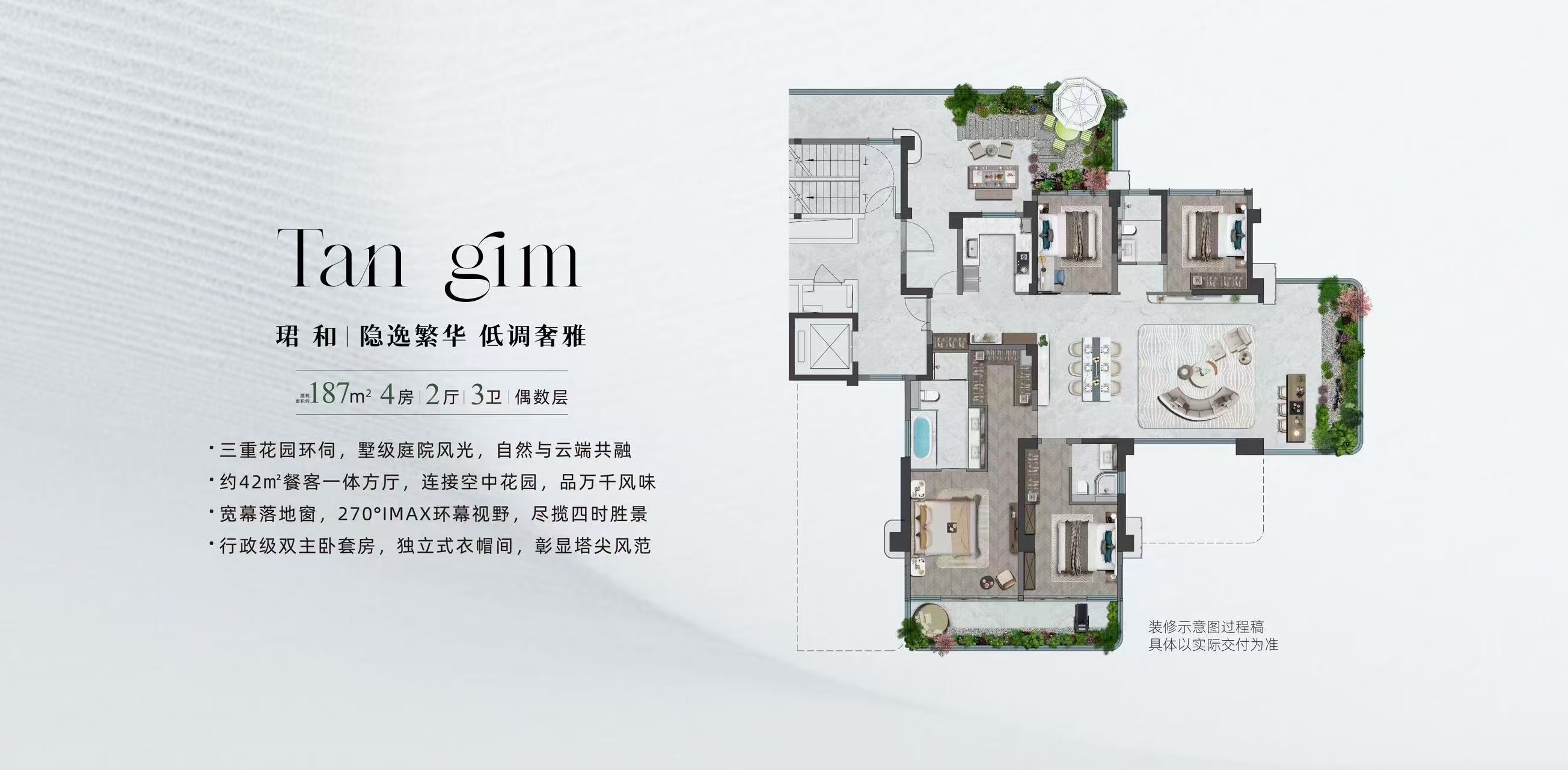 作为鼓楼区首个第四代住宅项目,保利天珺在户型创新上颇具亮点。主力187㎡户型普遍采用LDKB一体化设计,配有大尺度观景阳台和多套房设计,部分户型还设计了约80㎡的空中露台,引入“空中庭院”概念。