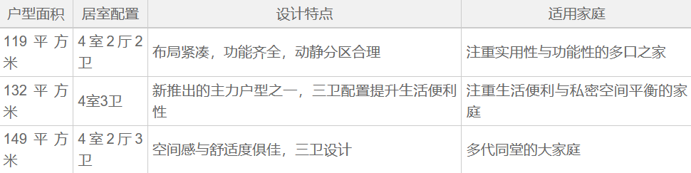 149平方米的户型则配置为4室2厅3卫,空间感与舒适度俱佳,三卫设计特别适合多代同堂的家庭。所有户型均注重全明格局和南北通透,确保良好的采光通风效果。