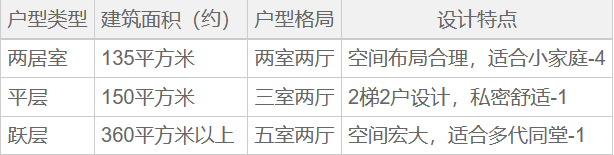 对于追求更宏大居住尺度的家庭,项目也提供了建筑面积超过360平方米的五室两厅跃层(叠拼)户型,能满足多代同堂或高端改善的终极需求。资料还显示,项目亦提供135平方米的两居室户型。