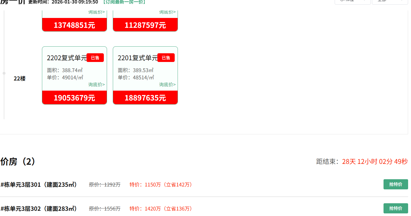 市场环境变化使项目价格进行了调整,曾预计售价从每平方米8.72万元下调至6.42万元。2023年通过司法拍卖成交的一套283.4平方米房源,折合单价约4.8万元/平方米。