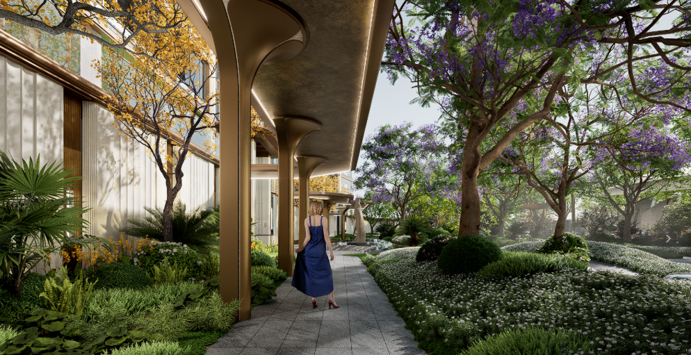 项目构筑三重防护体系,将噪声层层过滤:通过科学规划布局、丰富绿化和人车分流,使社区日间噪声平均值低于55dB。
