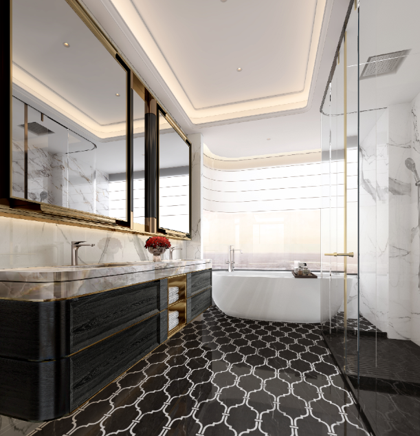项目颜值耀眼,外立面以全铝板+玻璃幕墙打造臻奢质感,超高窗墙比不仅实现一线顶豪配置,还提升了景观视野。项目总共选用20多种奢石与UHPC等高端材质,顶豪项目标识鲜明且有特色。