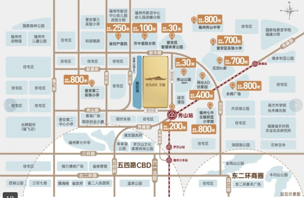 项目距地铁1号线秀山站仅约300米,属于真正的地铁房,6站即可直达东街口商圈。周边800米内形成了成熟的生活圈:商业配套包括五四in象、永辉广场;医疗资源有福建省妇幼保健院与福州市中医院;生态休闲则有秀山公园与智慧体育公园。