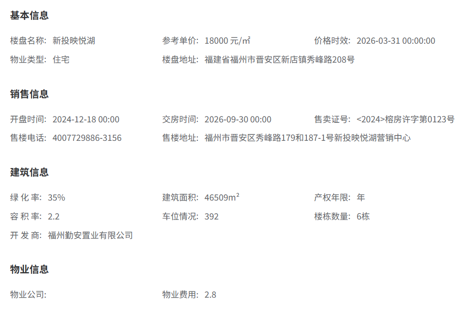 新投映悦湖由福州三江口建设发展有限责任公司开发,该公司隶属于福州新区开发投资集团,是一家国有房企。