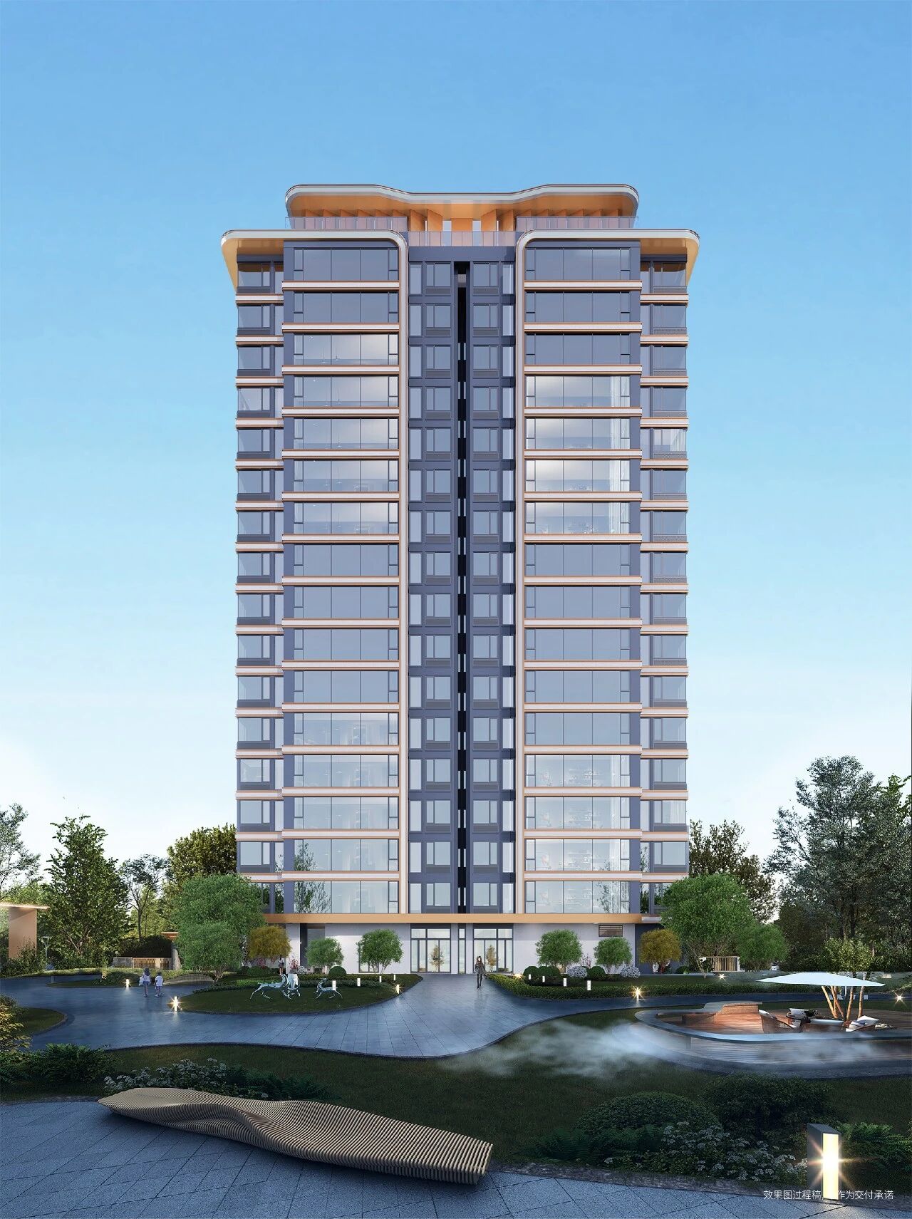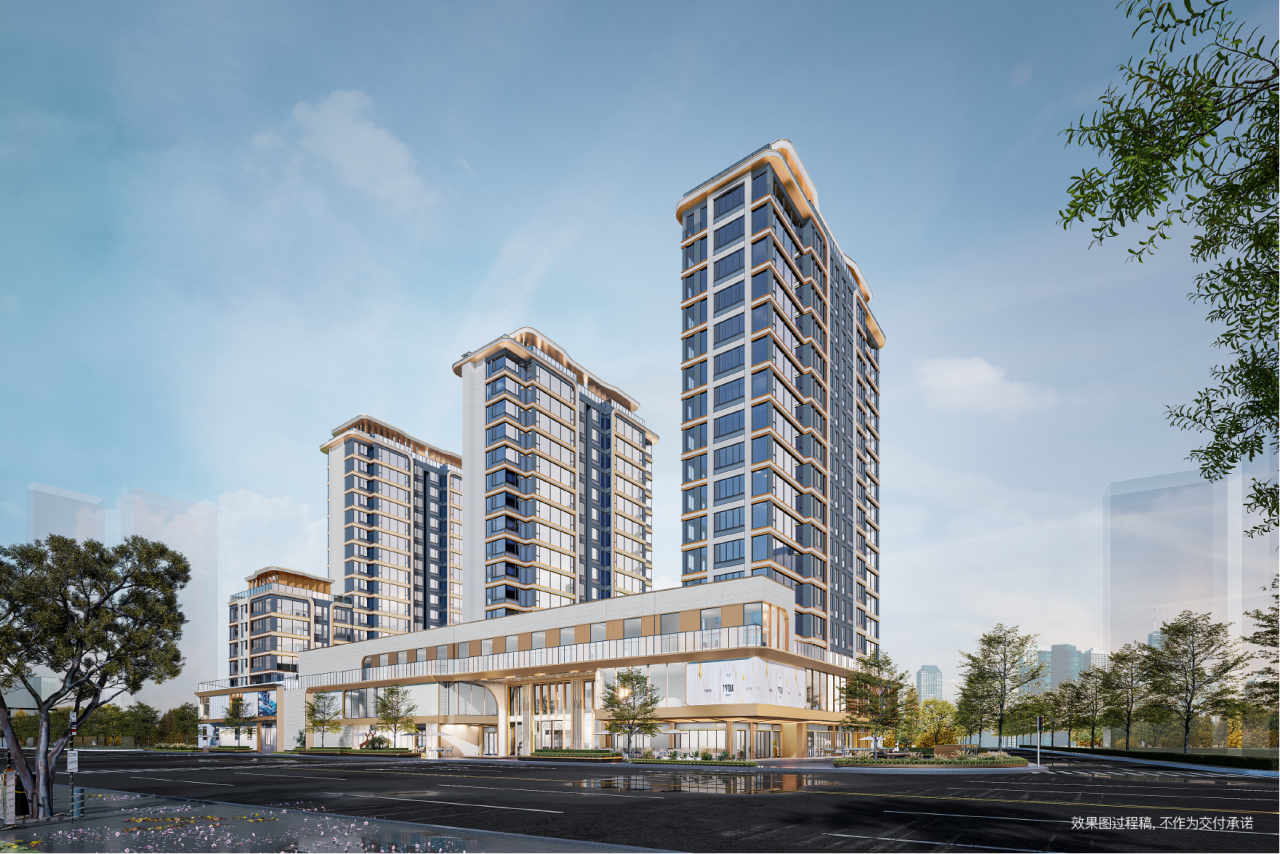 建筑美学:建筑立面采用典雅现代的海派风格,以高级灰、香槟金为主色调,搭配大面积玻璃幕墙和蓝灰色金属线条,简约而不失奢华。屋顶的“鎏金王冠”造型,成为区域内的标志性天际线。