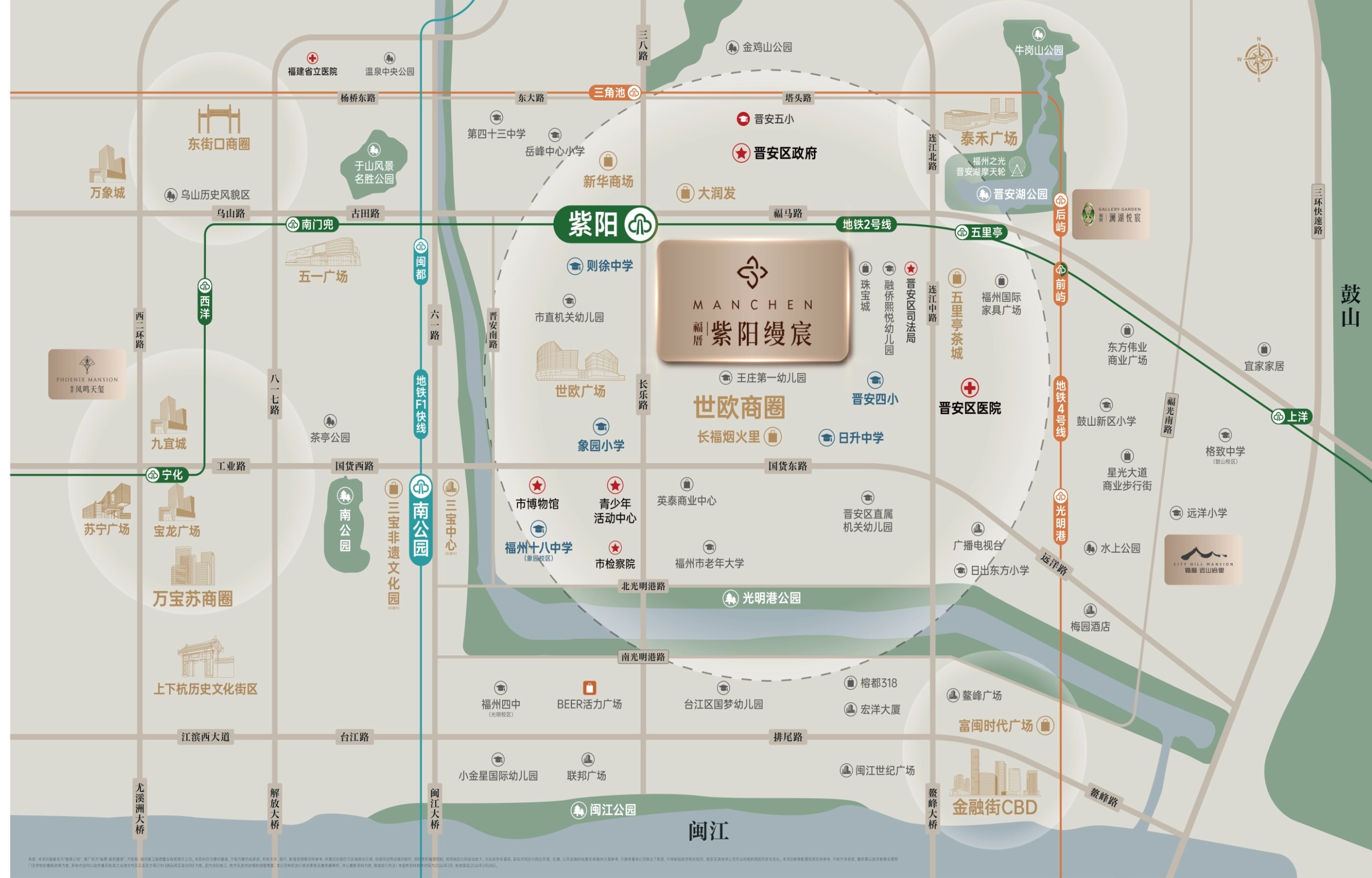 生态与文娱资源富集:项目被晋安河公园晋安湖公园光明港公园南公园四大城市绿肺环绕,推窗见绿,出门入园,为业主提供了稀缺的自然休闲空间。2.5公里范围内,还有福州市博物馆福州市青少年活动中心以及在建的福州三宝非遗文化园,人文气息浓厚。