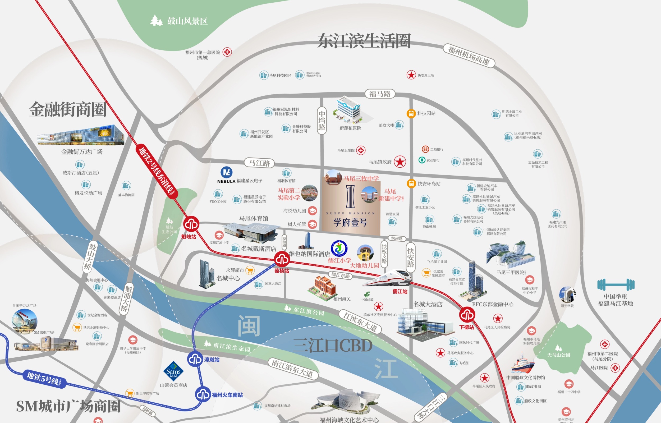 除了教育,项目的交通条件同样可圈可点。社区紧邻在建的福州地铁2号线东延线儒江站,预计步行约8分钟即可抵达。未来地铁通车后,将极大拉近马尾与福州主城区的时空距离,通勤效率显著提升。目前,周边20个公交站点网络也已覆盖,自驾经由中档路、马江路可快速上鼓山大桥,约15分钟车程直达台江商圈,连接性良好。