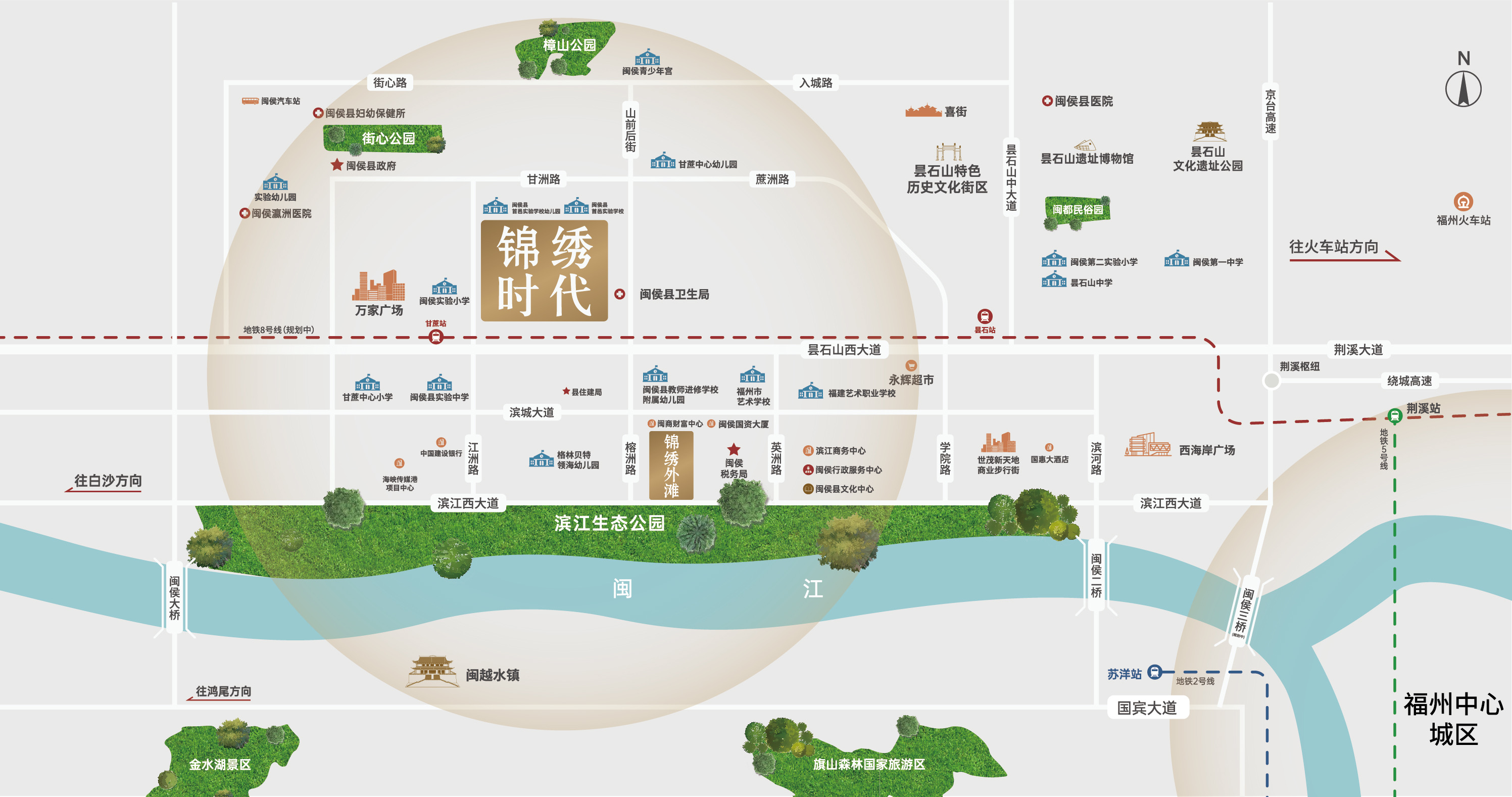 文化休闲:靠近昙石山文化街区、江滨公园;闽都民俗园、县博物馆营造浓厚文化氛围;通过配套建设的"锦绣桥"龙形景观天桥,居民可直达2500亩江滨生态园