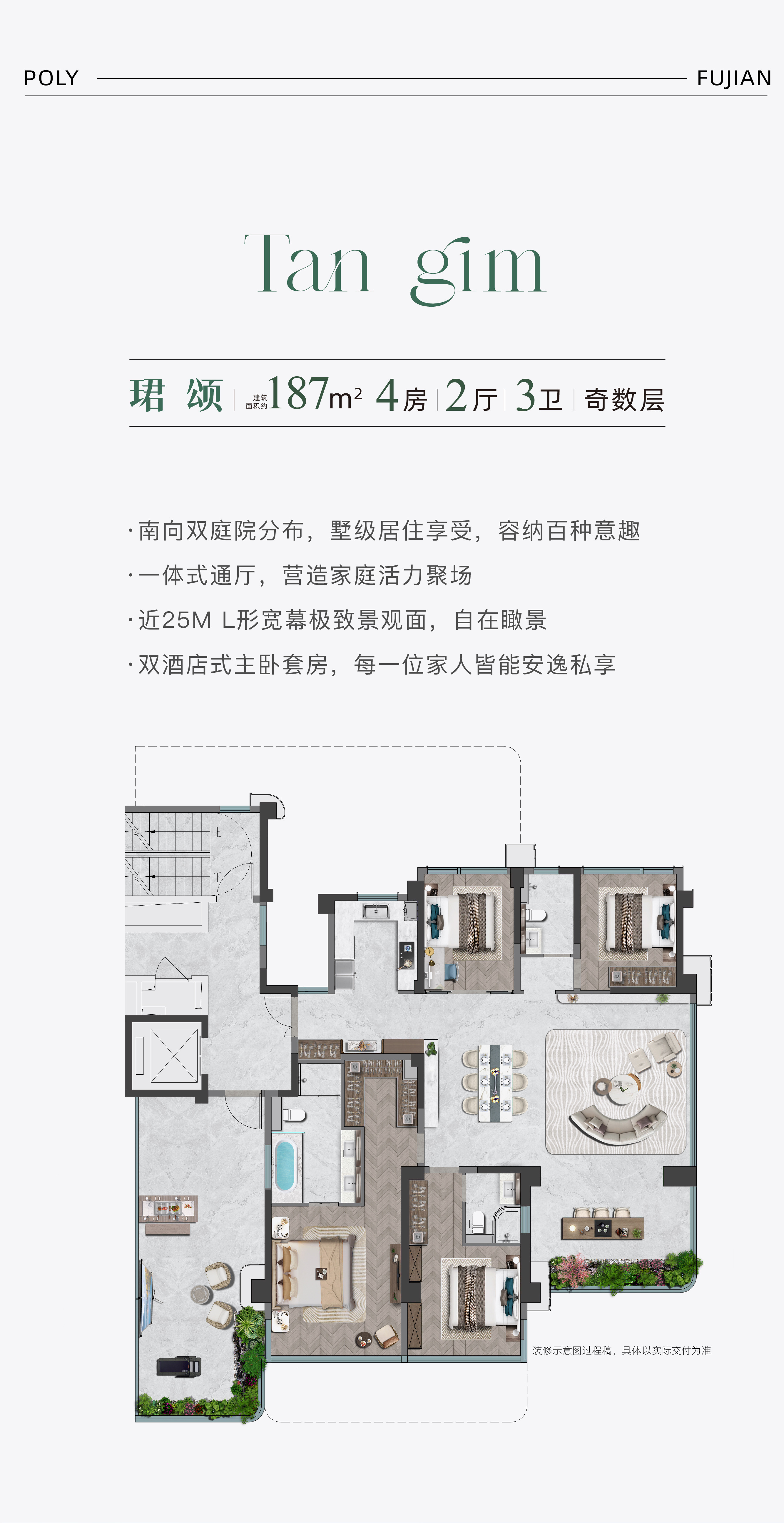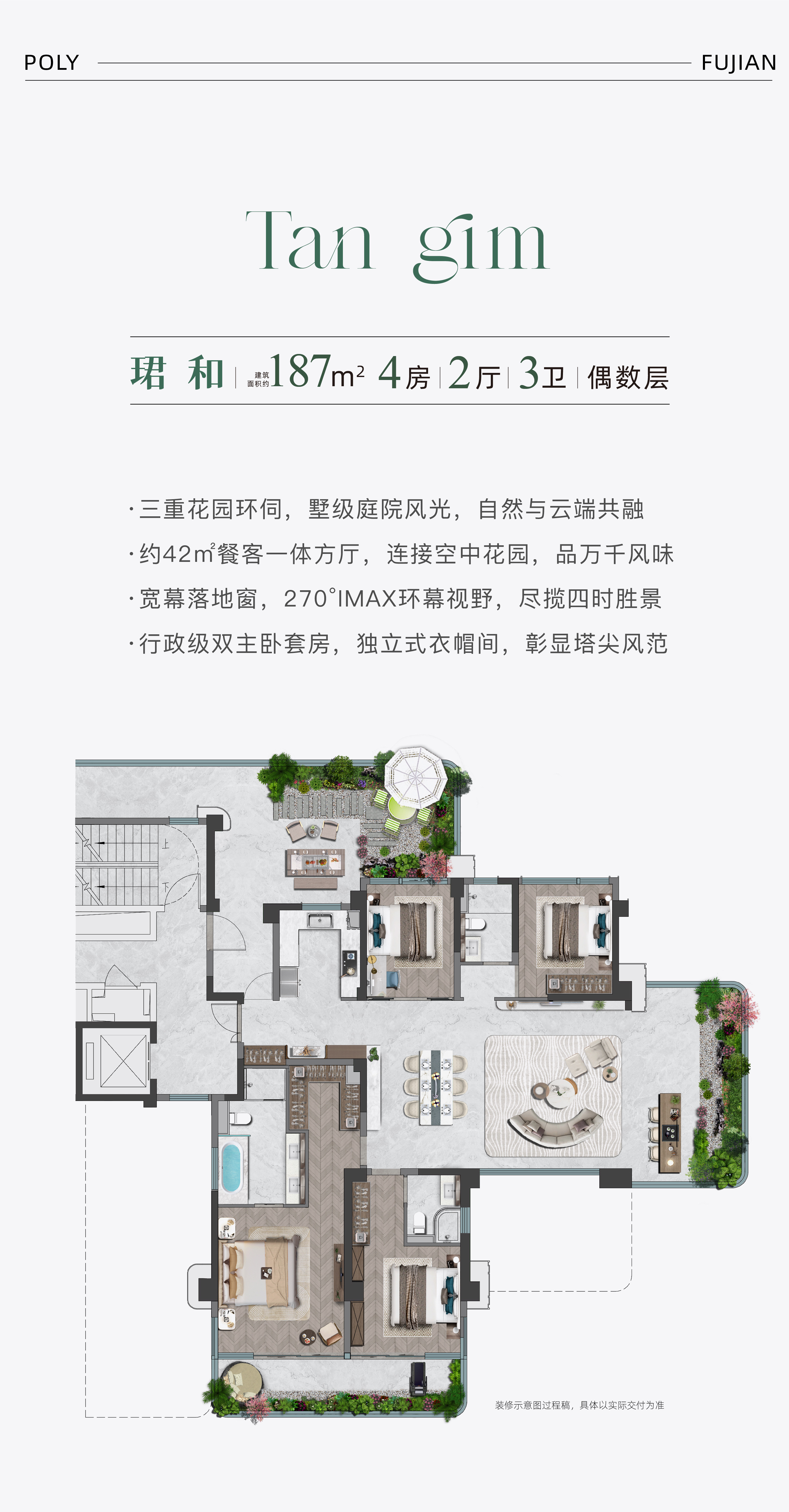 项目主打148㎡和187㎡两种纯大平层户型。其中187㎡四房两厅三卫户型采用边厅布局,配备约6米层高空中庭院,实现270°环景视野;主卧套房带全景飘窗,精装交付含智能家居系统。
