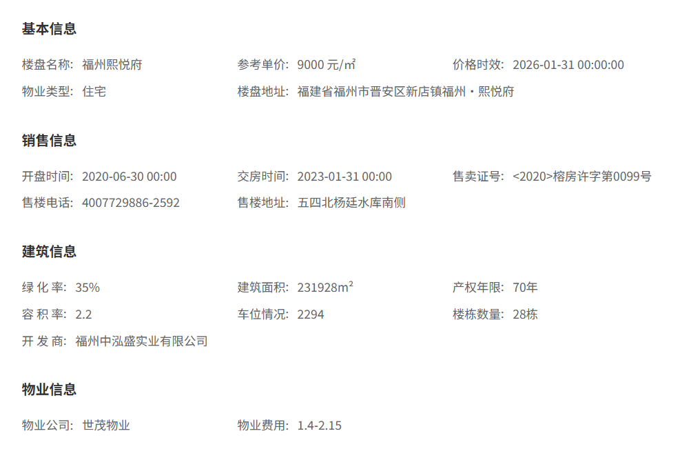 物业公司为世茂天成物业服务集团有限公司福州分公司,物业管理费为2.15元/㎡·月。品牌物业的入驻,为后续的居住体验提供了一定保障。